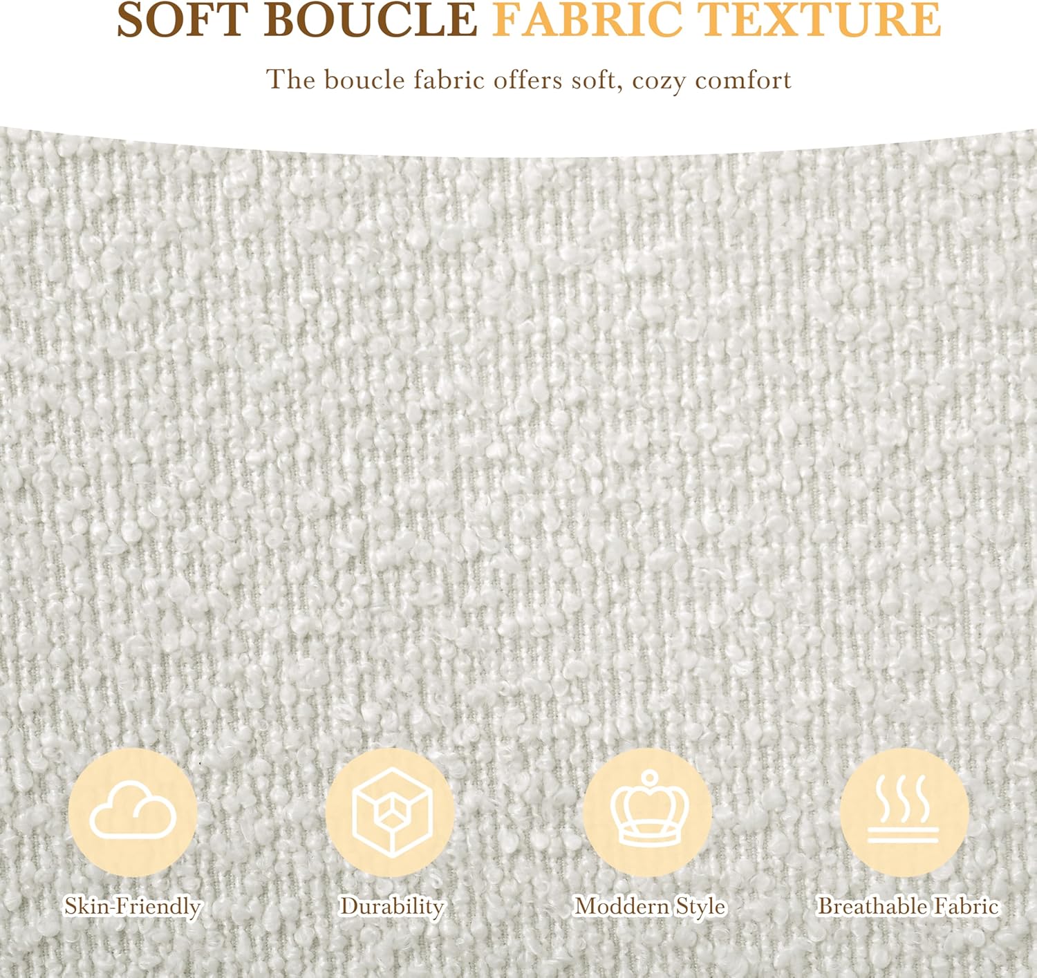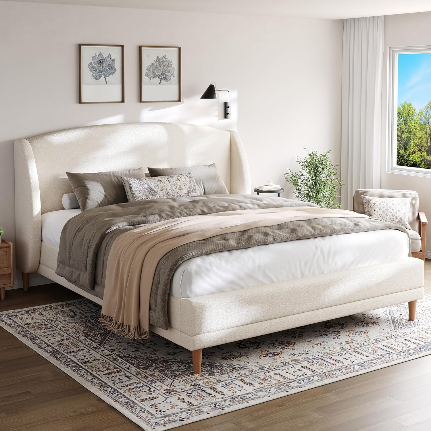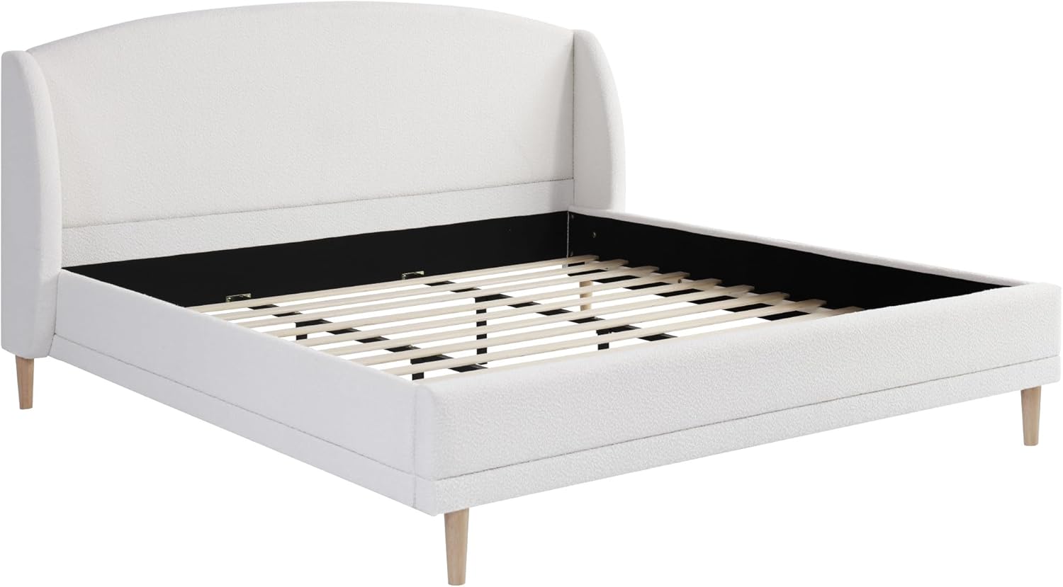 Christopher Knight Home Hazel King Size Bed Frame, Upholstered Platform Bed, Soft Boucle Wingback Headboard, Wood Bed Support and Slats, Curved-Shaped Headboard King Beds for Adult, 45.60" H White