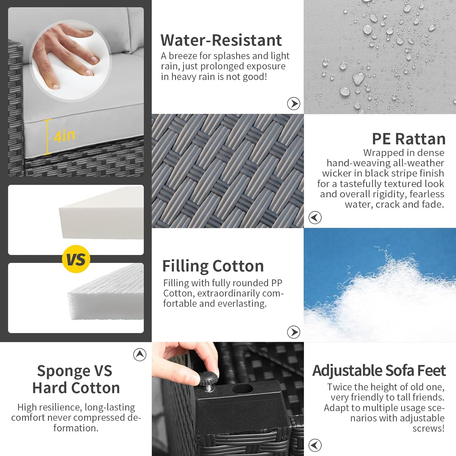 Rattaner Patio Wicker Furniture Set 6 Pieces Outdoor HDPE Wicker Conversation Couch Sectional Chair Sofa Set with Grey Cushions